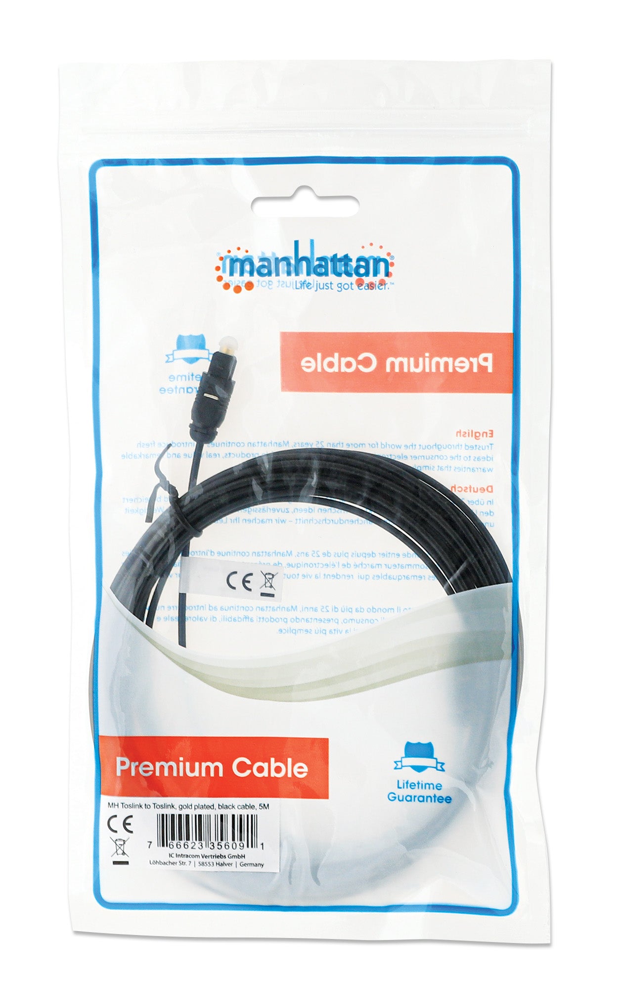 2 x Toslink S/PDIF mâle, 5 m, contacts plaqués or, noir