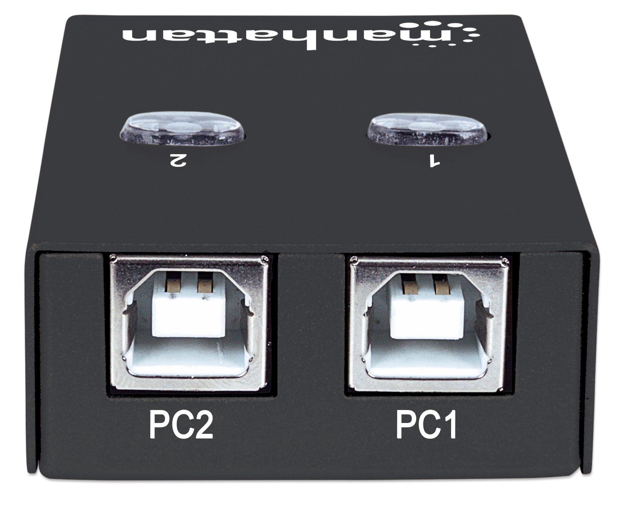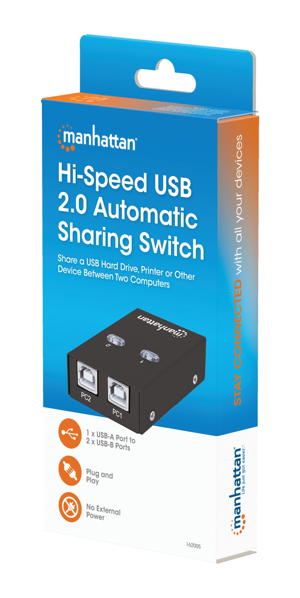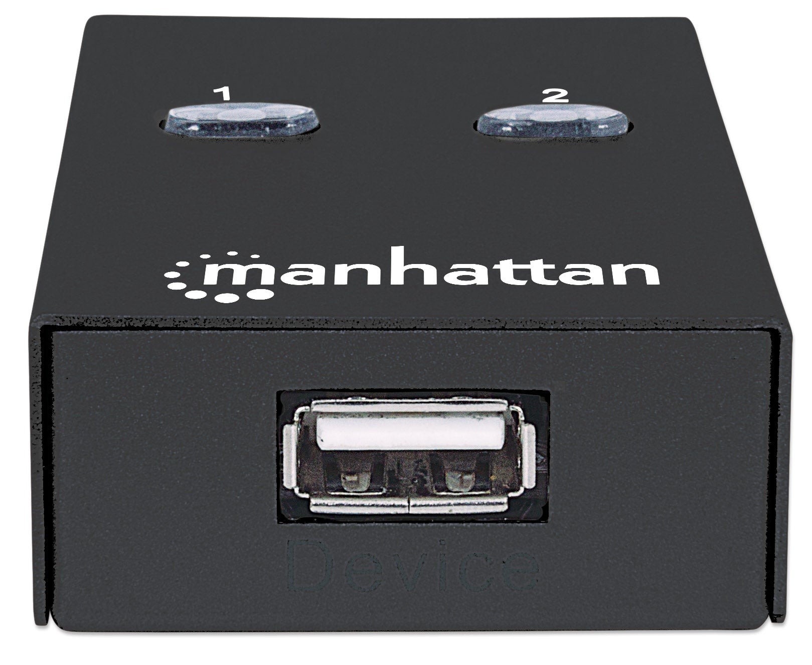 Connectez facilement votre périphérique USB et partagez-le.Le commutateur de partage automatique USB 2.0 haut débit de Manhattan permet de partager facilement un dispositif USB entre deux ordinateurs. Il convient parfaitement à une utilisation personnelle ou professionnelle, lorsque plusieurs utilisateurs souhaitent partager un modem avec câble USB, une imprimante, un appareil photo numérique, un scanner, un disque dur externe ou d'autres périphériques. Activez la commutation d'accès à la demande à l'aide d'un simple clic sur un bouton de l'écran, ou utilisez les commutateurs intégrés pour sélectionner manuellement un ordinateur actif. Installation simple et rapideInstallation Plug-and-Play compatible Windows. Le commutateur de partage automatique USB 2.0 haut débit de Manhattan ne nécessite ni pilote spécifique, ni alimentation externe. Connectez-vous à l'aide des câbles USB fournis pour accéder rapidement aux périphériques les plus courants.