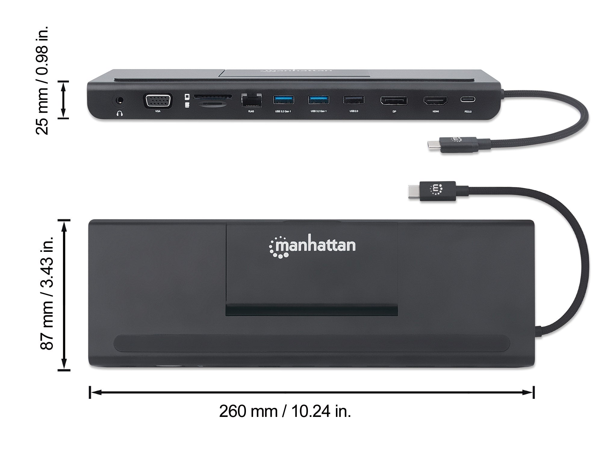 - Prend en charge la fonction USB Power Delivery (PD) jusqu'à 100 W; nécessite un chargeur PD externe - disponible de Manhattan