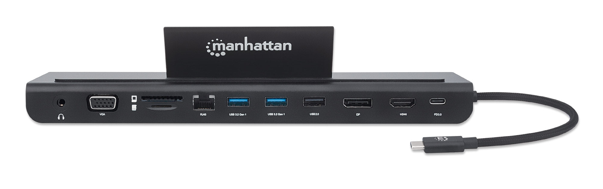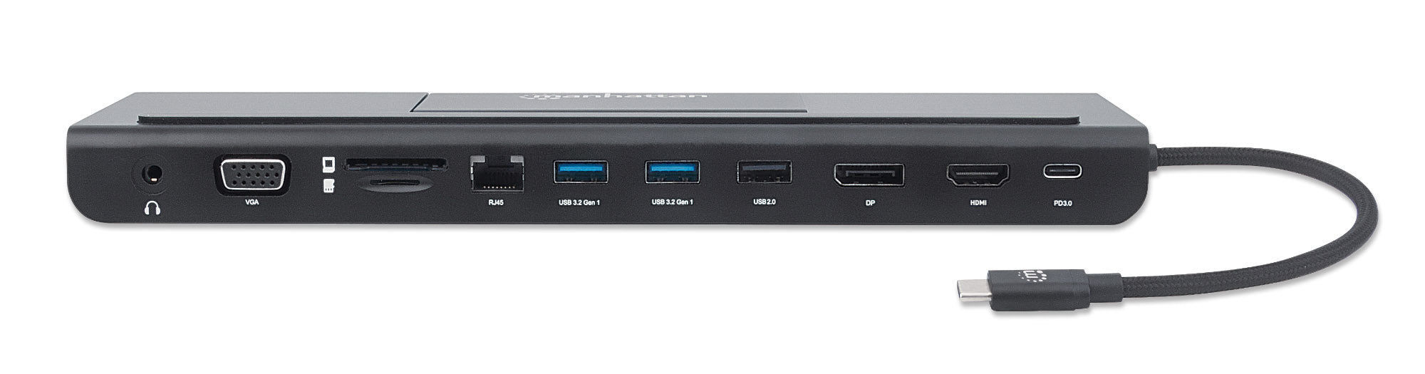- Docking station multifonction permettant de connecter simultanément un périphérique USB-C à des écrans HDMI, DisplayPort et VGA, deux ports USB 3.2 Gen 1 type-A, un port USB 2.0 type-A, un port Ethernet 10/100/1000 Mbit/s, un port stéréo 3,5 mm, un port d'alimentation USB-C et lecteur de carte SD