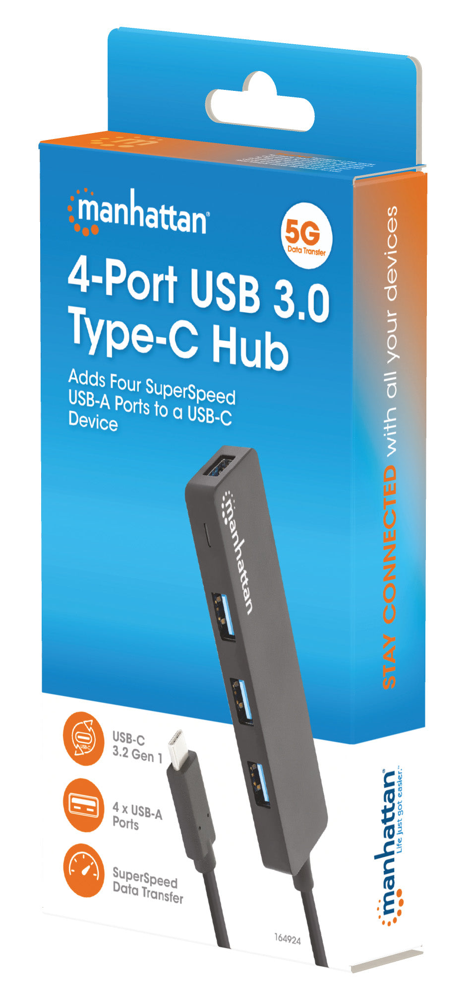 Le hub Manhattan 4 ports USB 3.0 Type-C transforme l'un des ports USB-C de votre appareil en quatre ports USB-A SuperSpeed, vous permettant de connecter facilement un clavier, une souris, une clé USB et plus encore. Les ports SuperSpeed du hub sont rétrocompatibles, ce qui vous permet de connecter des périphériques USB-A plus anciens à votre nouvel appareil USB-C. Les appareils conformes à la spécification SuperSpeed USB 3.2 Gen 1 (anciennement connu sous le nom de USB 3.0) peuvent atteindre des vitesses de transfert allant jusqu'à 5 Gbps pour le stockage externe, l'impression et plus encore. De plus, vous pouvez charger votre téléphone ou votre tablette, car le hub fournit jusqu'à 5 V / 1 A de puissance.