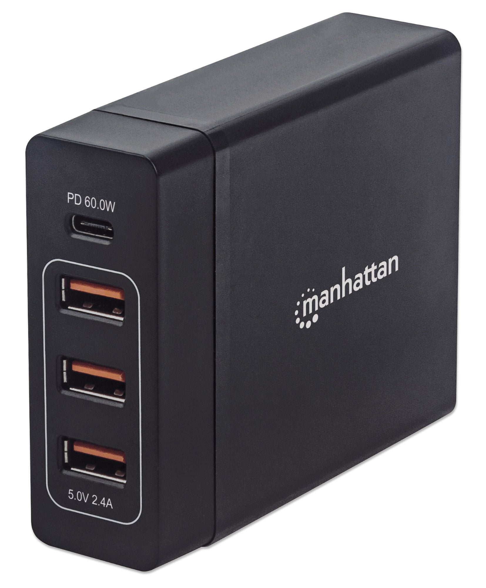 Un port d'alimentation USB-C jusqu'à 60 W, trois ports de charge USB-A partageant jusqu'à 12 W / 2,4 A, noir