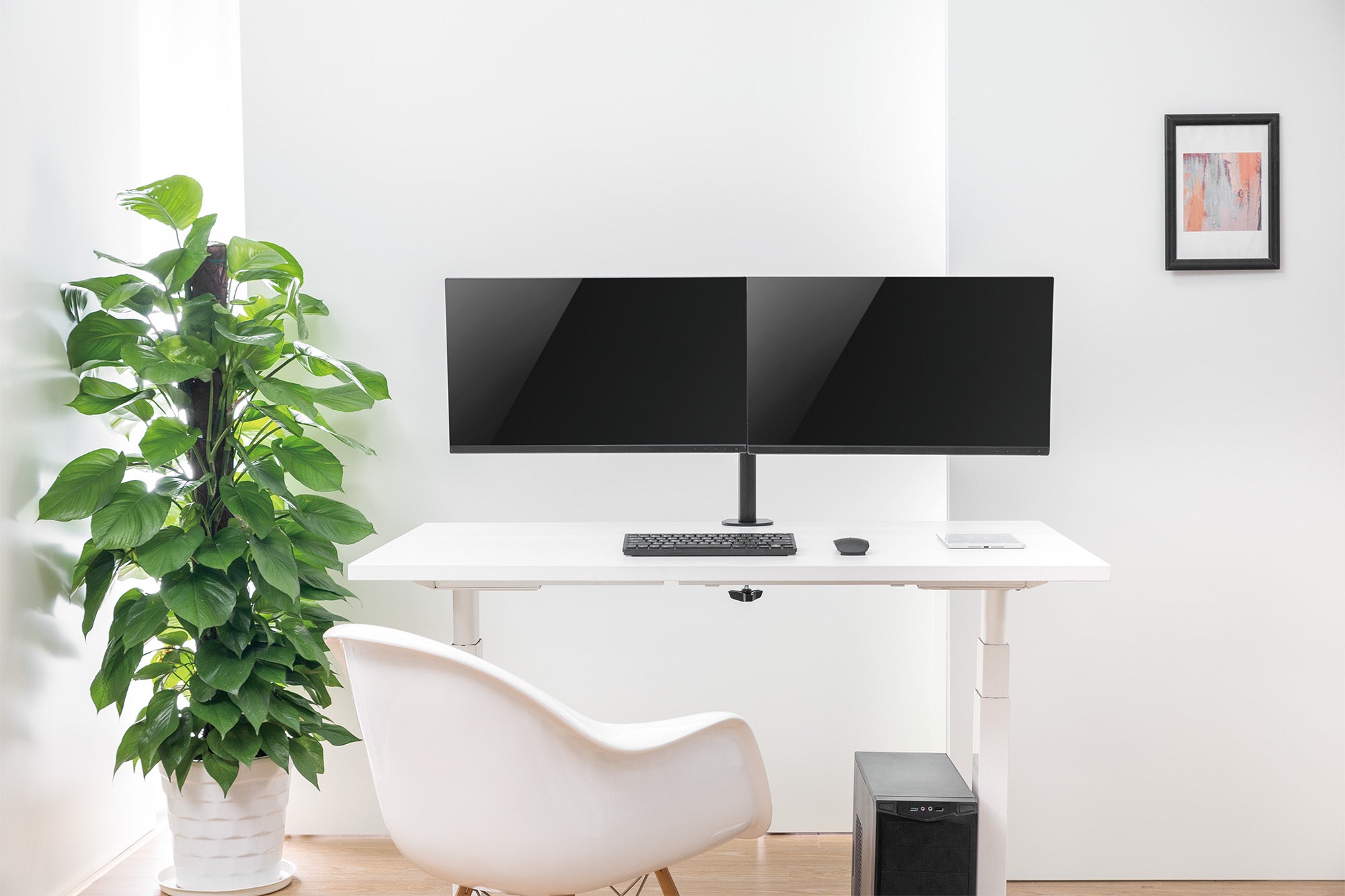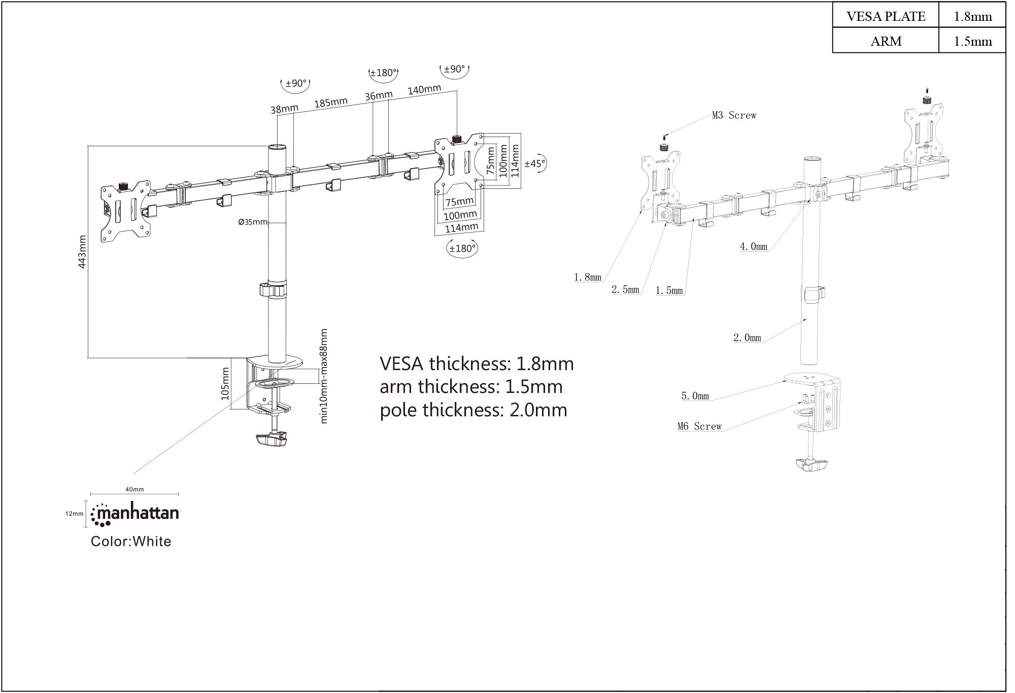 Gérez le bureau. Maximisez la productivité.L'installation d'un moniteur LCD au-dessus du bureau aide à maximiser l'efficacité d'un espace de travail potentiel. Le support de moniteur double universel Manhattan avec bras pivotants à double liaison améliore l'organisation sur le bureau, facilitant ainsi le travail sur l'ordinateur.Construit en acier durable, ce support de moniteur double dispose d'un serre-joint robuste qui permet un montage rapide, facile et sécurisé sans avoir besoin de percer des trous dans les bureaux ou les plans de travail. Ses réglages d'inclinaison, de rotation, de latéralité, de hauteur et de tension entièrement ajustables créent la position parfaite pour augmenter le confort et la productivité. De telles capacités d'ajustement peuvent même aider à réduire la fatigue oculaire ou les tensions au cou et au dos. De plus, le poteau du support permet une rotation facile du moniteur pour permettre à d'autres de visualiser des présentations et des productions multimédias presque sous n'importe quel angle.