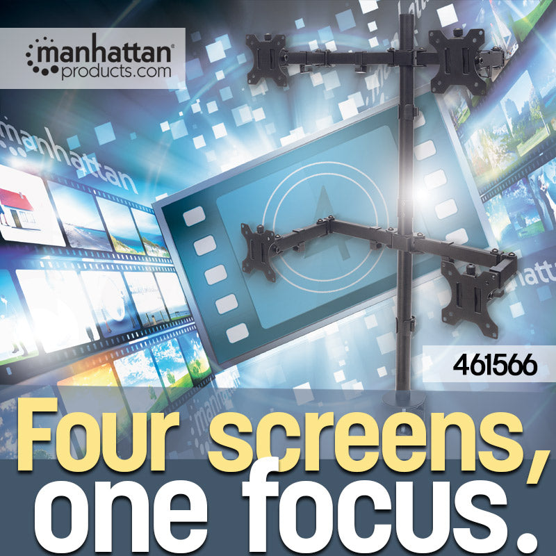L'installation d'un moniteur LCD au-dessus du bureau aide à maximiser l'efficacité d'un espace de travail potentiel. Le support universel pour quatre moniteurs Manhattan avec bras pivotants à double liaison améliore l'organisation sur le bureau, facilitant ainsi le travail sur l'ordinateur.