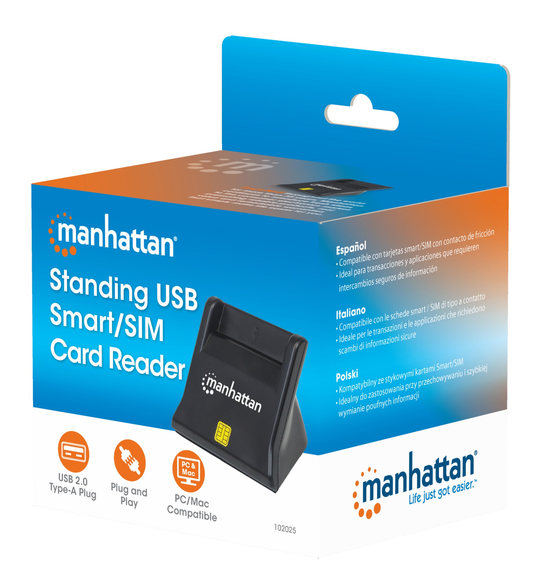Idéal pour les ordinateurs de bureau et les ordinateurs portables sans lecteurs intégrés, le lecteur de carte Smart/SIM USB debout Manhattan s'installe facilement en utilisant n'importe quel port USB ainsi que le logiciel et le pilote disponibles sur la page du produit. Plug and play avec compatibilité Windows et Mac, il ne nécessite aucune alimentation externe ni câbles pour une connexion USB simple.