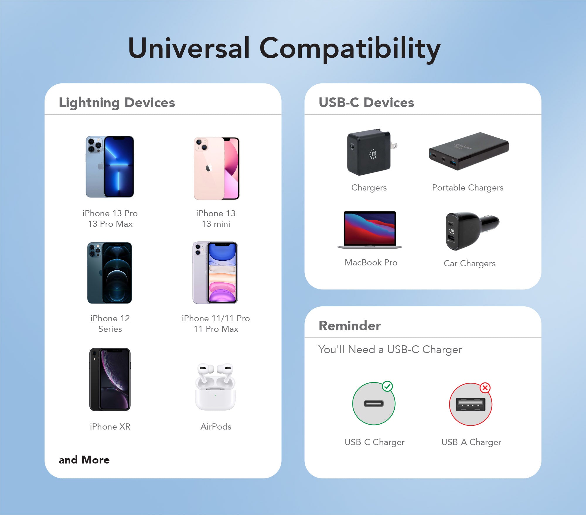- Appareils Lightning avec prise en charge de la charge rapide/Power Delivery, y compris, mais sans s'y limiter : iPhone 13, 13 Pro, 13 mini, 13 Pro max, 12, 12 mini, 12 Pro, 12 Pro max, 8, 8 Plus, X, XS, XR, XS Max, 11, 11 Pro, 11 Pro Max, iPhone SE (2nd generation), iPad Pro 10.5", iPad Pro 12.9" 1st/2nd generation, AirPods, AirPods avec étui de chargement sans fil, et AirPods Pro®