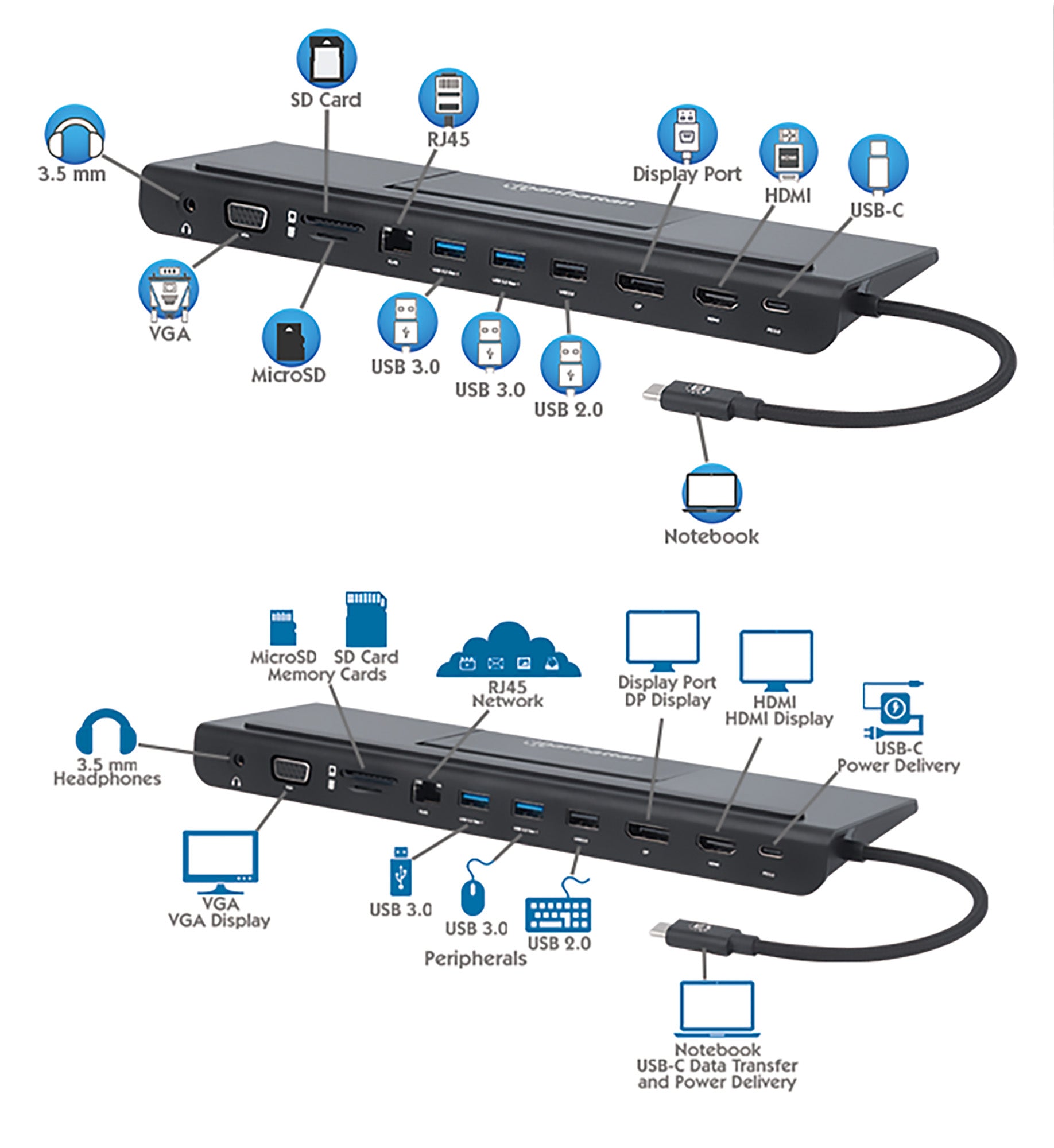 • Docking station multifonction permettant de connecter simultanément un périphérique USB-C à des écrans HDMI, DisplayPort et VGA, deux ports USB 3.2 Gen 1 type-A, un port USB 2.0 type-A, un port Ethernet 10/100/1000 Mbit/s, un port stéréo 3,5 mm, un port d'alimentation USB-C et lecteur de carte SD