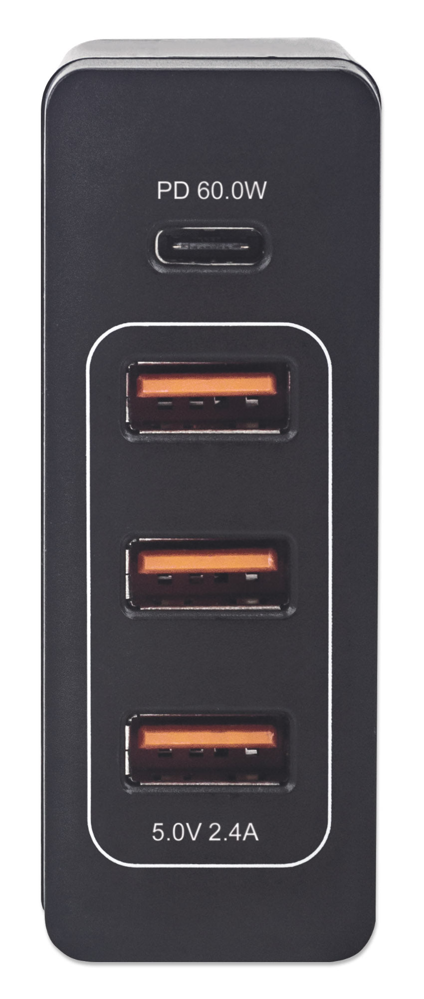 Un port d'alimentation USB-C jusqu'à 60 W, trois ports de charge USB-A partageant jusqu'à 12 W / 2,4 A, noir