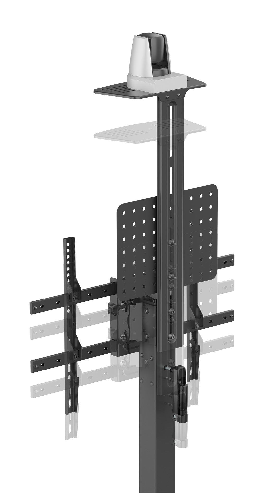 - Tablette réglable en hauteur, montage par le haut, avec dimensions de 285 x 150 mm et une charge maximale de 5 kg, idéale pour les visioconférences