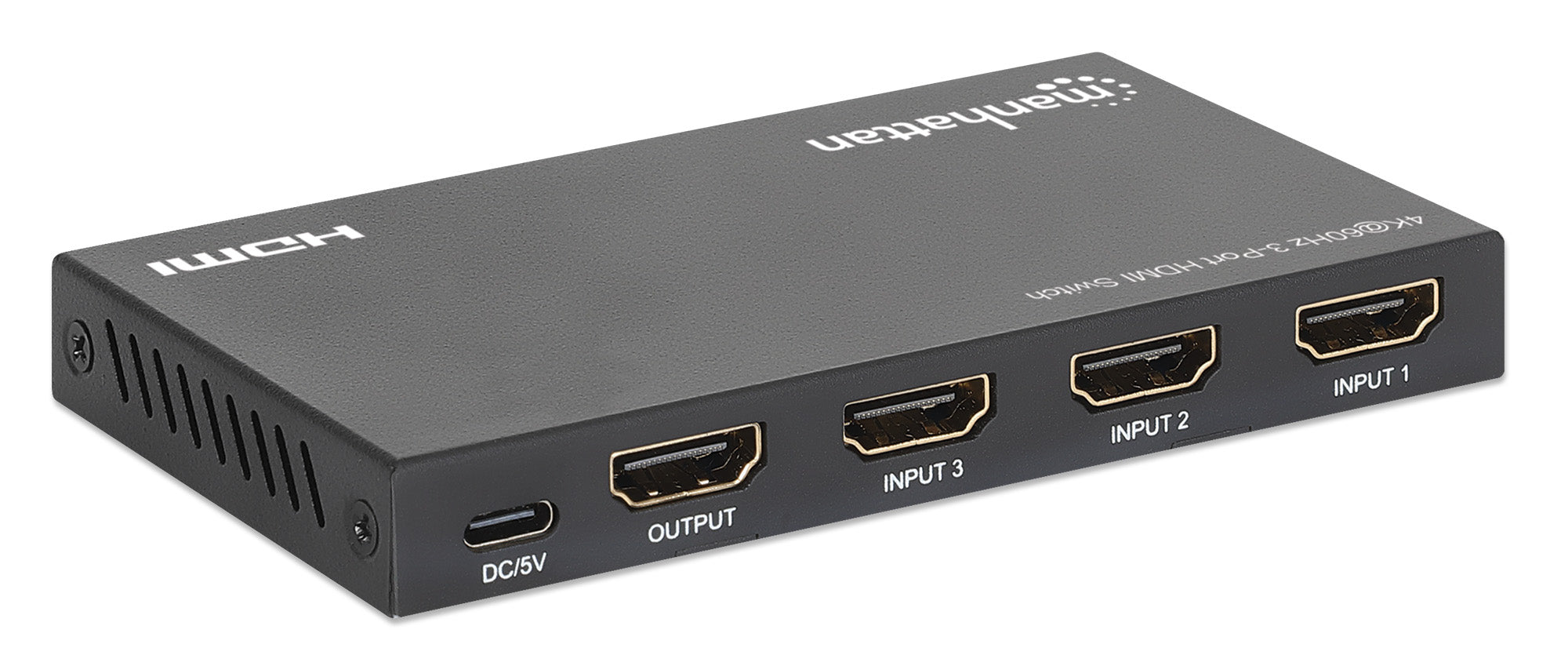- Quatre ports femelles HDMI 19 broches (trois entrées, une sortie)