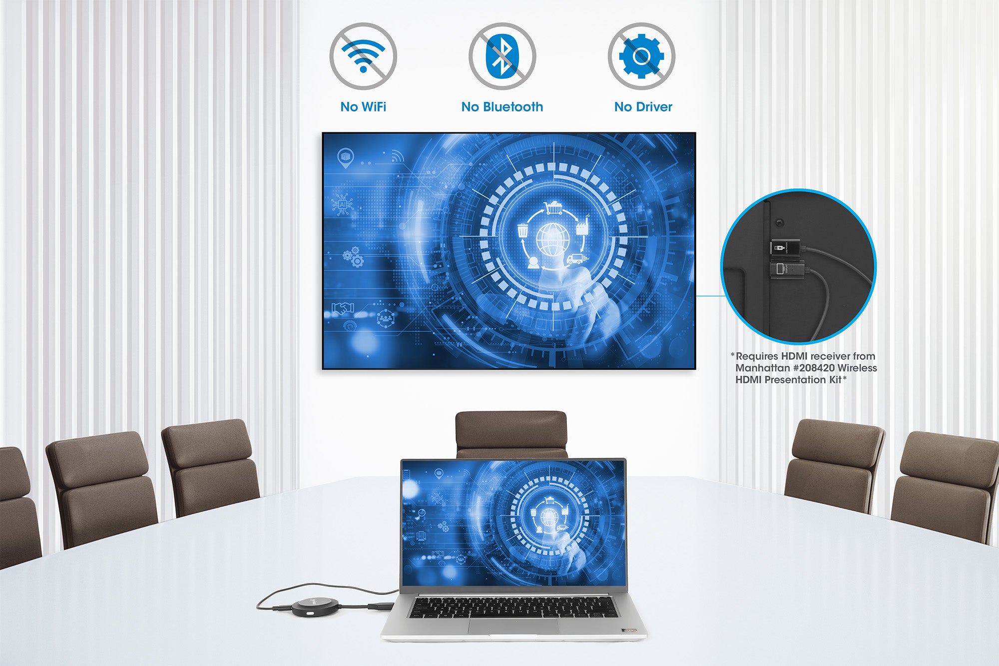 - Nécessite un récepteur HDMI à partir de Manhattan #208420 Kit de présentation HDMI sans fil; ne nécessite pas de Wi-Fi, d'Ethernet ou de technologies de partage d'écran comme AirPlay, Miracast, Google Cast, WiDi ou Samsung® Smart View.