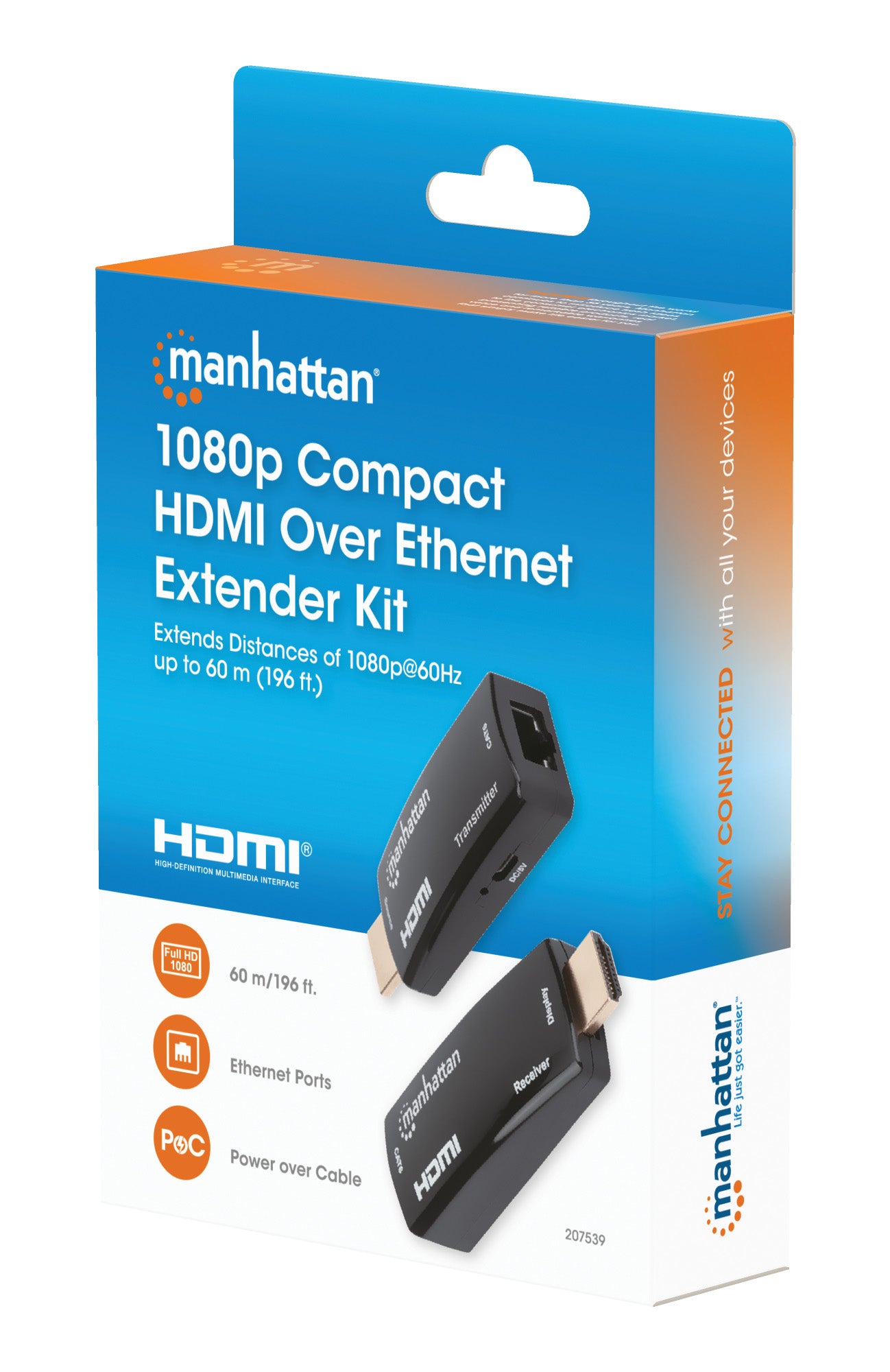 Le Kit Extendeur HDMI sur Ethernet Compact 1080p de Manhattan peut connecter presque n'importe quelle source HDMI numérique (par exemple, console de jeux [PlayStation®, Xbox® et plus], lecteur Blu-ray, récepteur satellite, enregistreur numérique, etc.) à un écran HD ou un projecteur à une distance allant jusqu'à 60 m (196 ft.) avec un câble Ethernet Cat6. Le Kit fournit une transmission vidéo en résolution 1080p@60Hz et audio multicanal sur de plus longues distances que les câbles HDMI seuls. Son design mince et compact est idéal pour les installations dans des espaces restreints ou pratiquement partout.