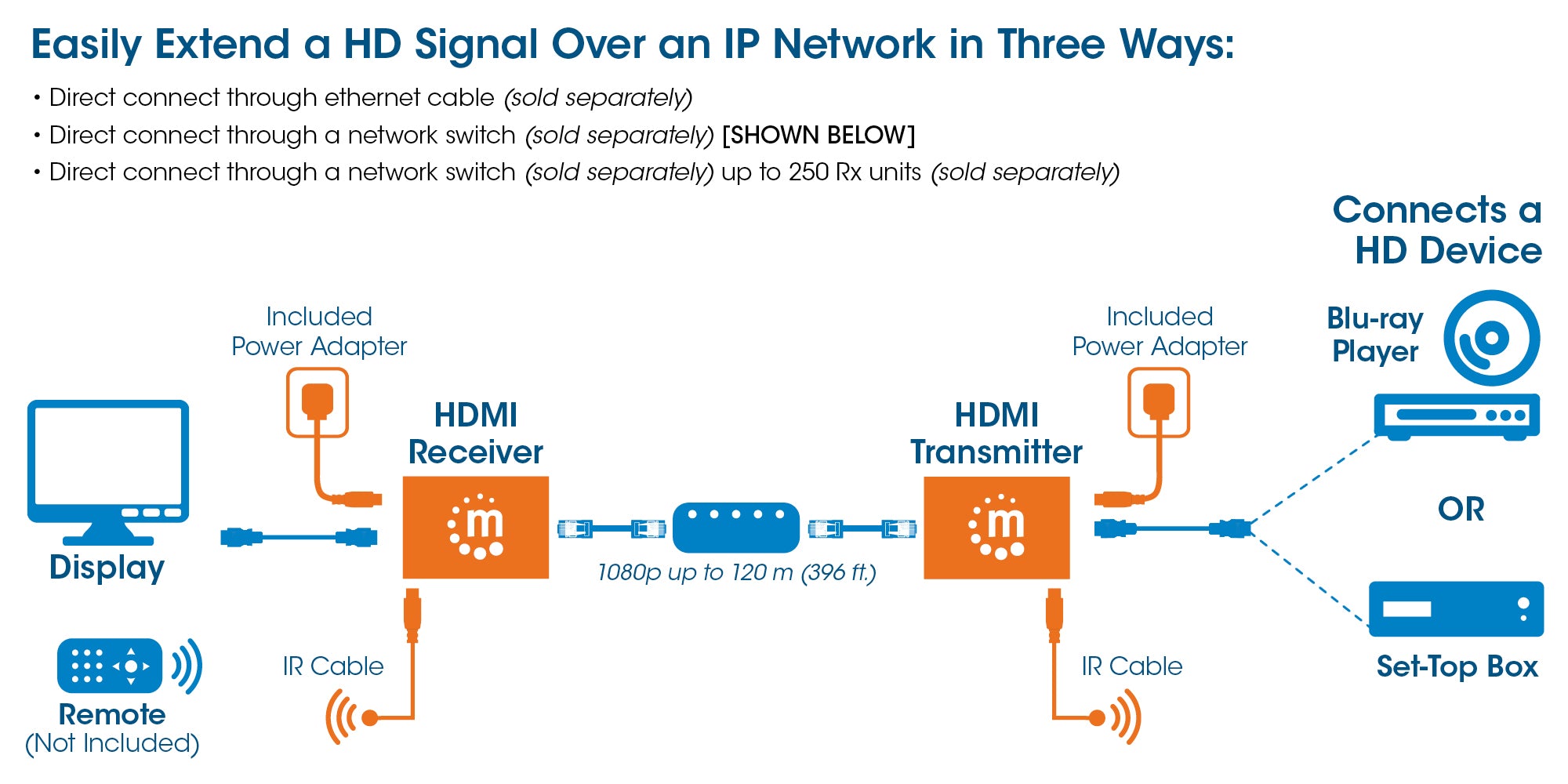 Le Kit d'Extenseur HDMI sur IP Manhattan 1080p est la solution idéale pour connecter pratiquement n'importe quelle source HDMI numérique (PlayStation, Xbox, lecteur Blu-ray, récepteur satellite, enregistreur numérique, etc.) à un écran HD ou un projecteur jusqu'à 120 m (396 ft.) de distance en utilisant un réseau IP et un seul câble Ethernet. Ce Kit d'Extenseur HDMI sur IP alimenté fournit une transmission vidéo en résolution 1080p et audio multicanal sur des distances plus longues que les câbles HDMI seuls. De plus, les modules émetteur et récepteur disposent de ports supplémentaires de 3,5 mm pour l'Infra-Rouge (IR) afin de permettre le contrôle de la source depuis l'emplacement de l'affichage.