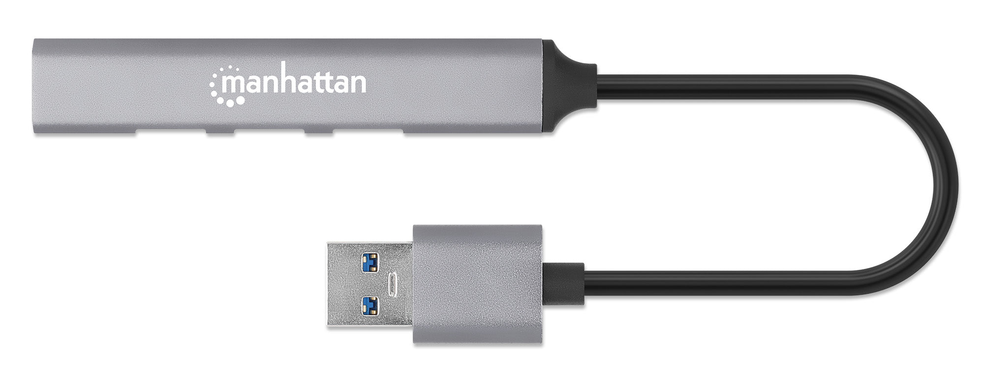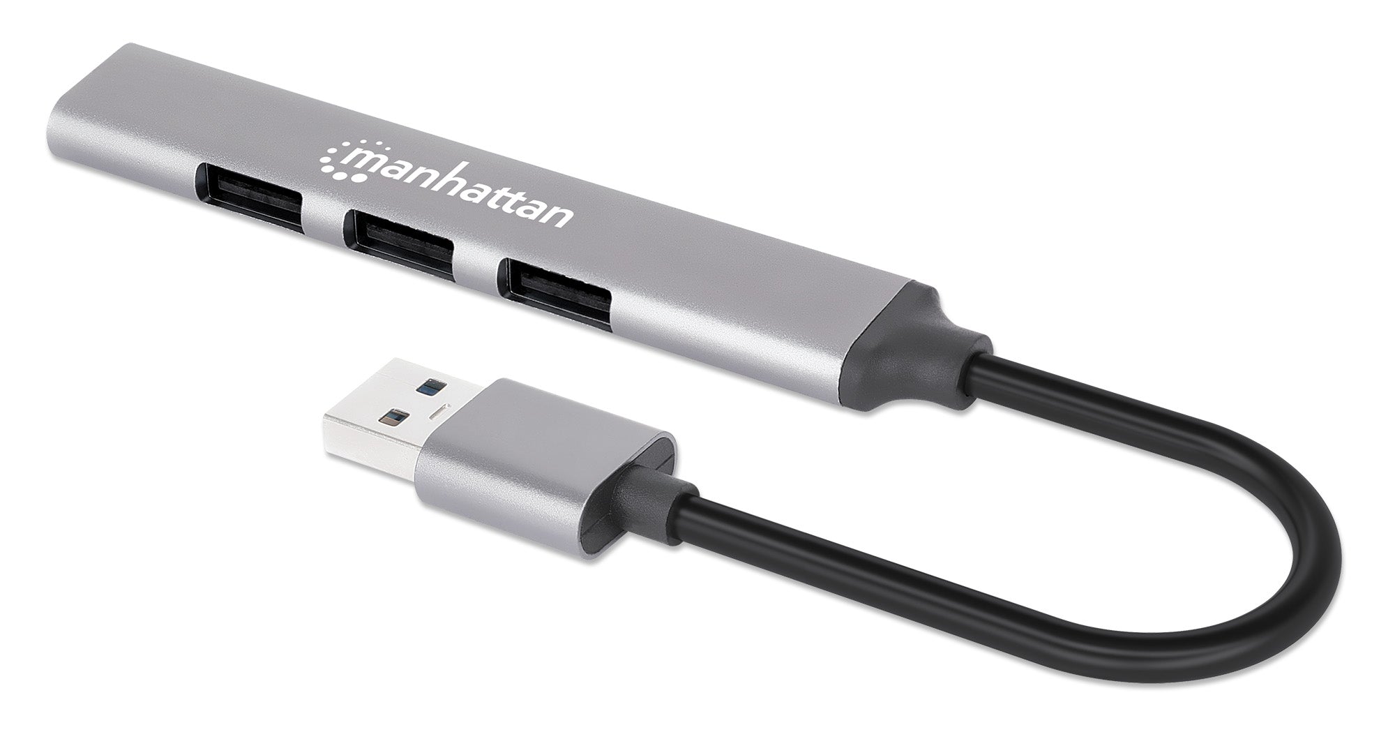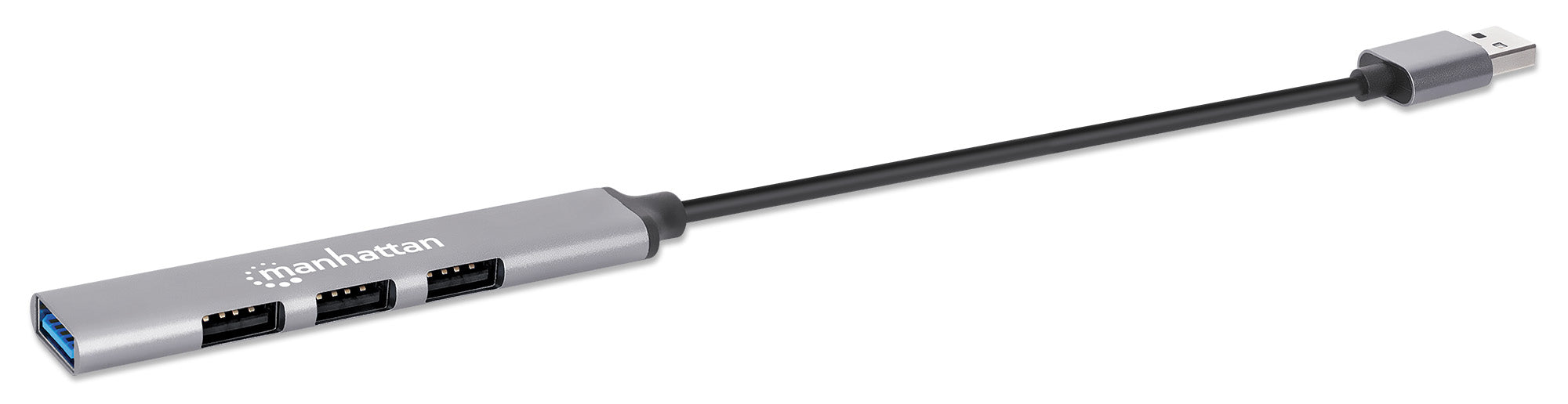 USB-A mâle vers quatre USB-A femelles, un port USB 3.2 Gen 1 à 5 Gbps (anciennement USB 3.0), trois ports USB 2.0 à 480 Mbps, alimenté par bus, aluminium, espace gris