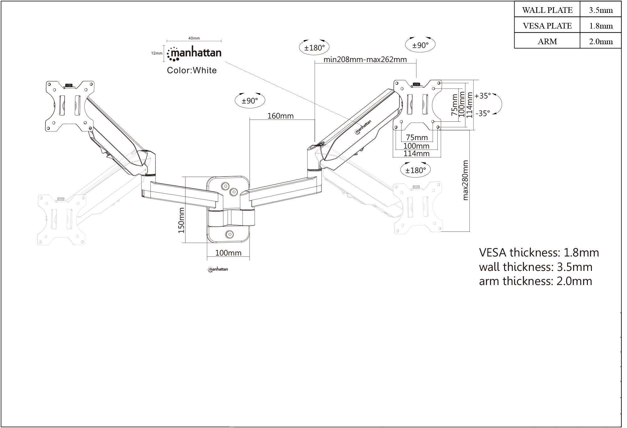 Ce support mural à double moniteur à ressort à gaz universel Manhattan offre deux bras articulés à ressort à gaz qui maintiennent en toute sécurité deux téléviseurs ou moniteurs de 17" à 32". Les ressorts à gaz de ce support favorisent un mouvement facile des moniteurs ou des téléviseurs vers un angle de vision plus confortable avec le moindre effort. Conçu pour libérer un espace de bureau précieux et maximiser la productivité, le support mural à double moniteur à ressort à gaz universel Manhattan offre plus de flexibilité, de portée et de plaisir global dans l'exécution de toute tâche.