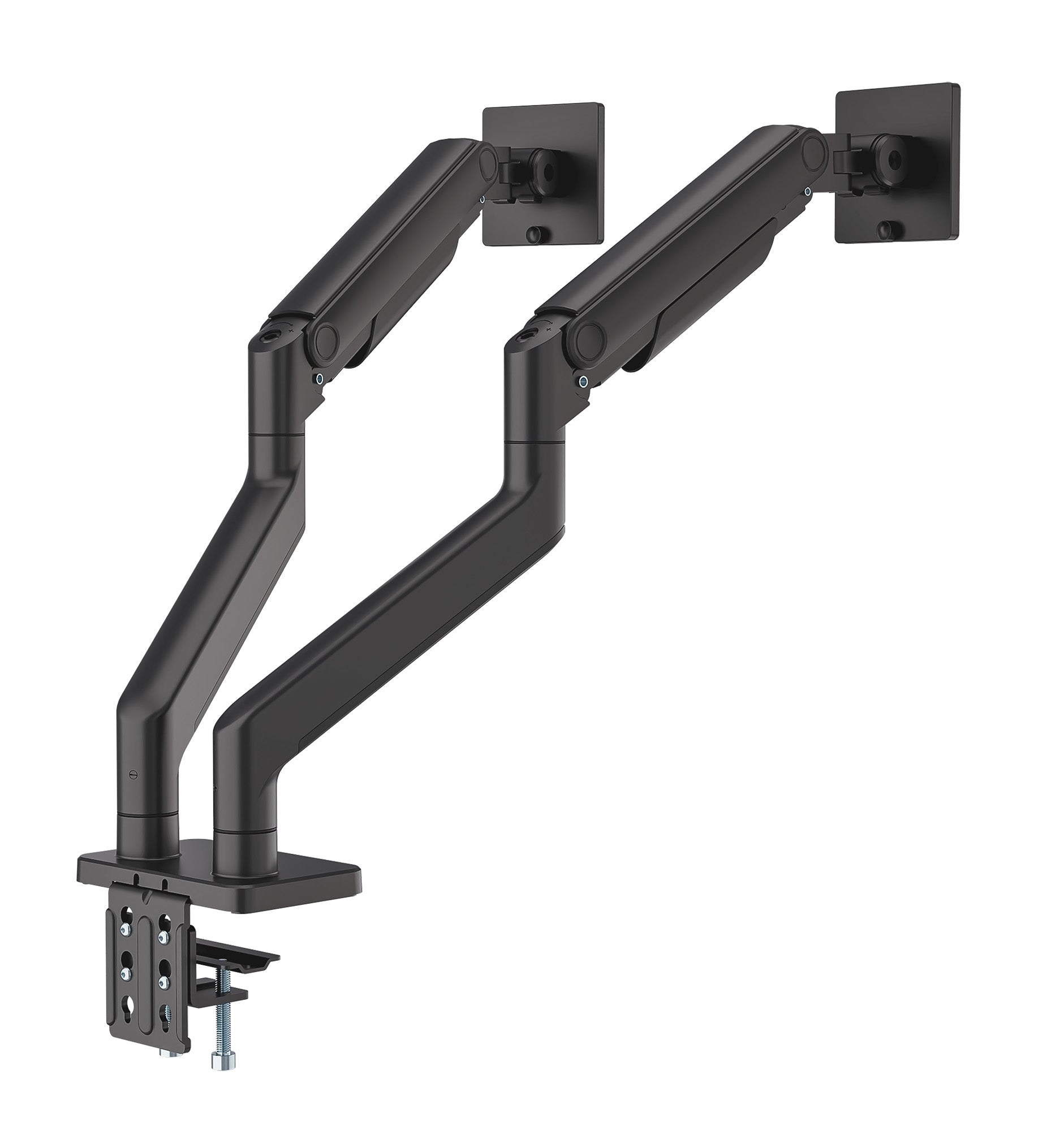 Le bras articulé peut supporter deux écran de 17" à 45” jusqu'à 20 kg, réglages complets de la hauteur, de l'inclinaison, du pivotement et de la rotation, installation avec la pince en C ou l’œillet, noir