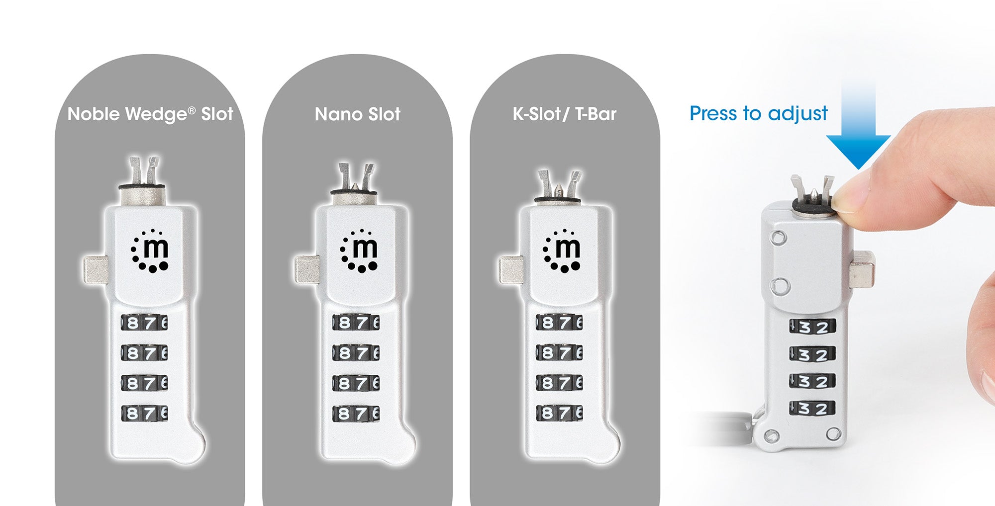 - Embout de verrouillage réglable compatible avec la cale Noble, Kensington® K-Slot (T-Bar) et la fente de sécurité nano