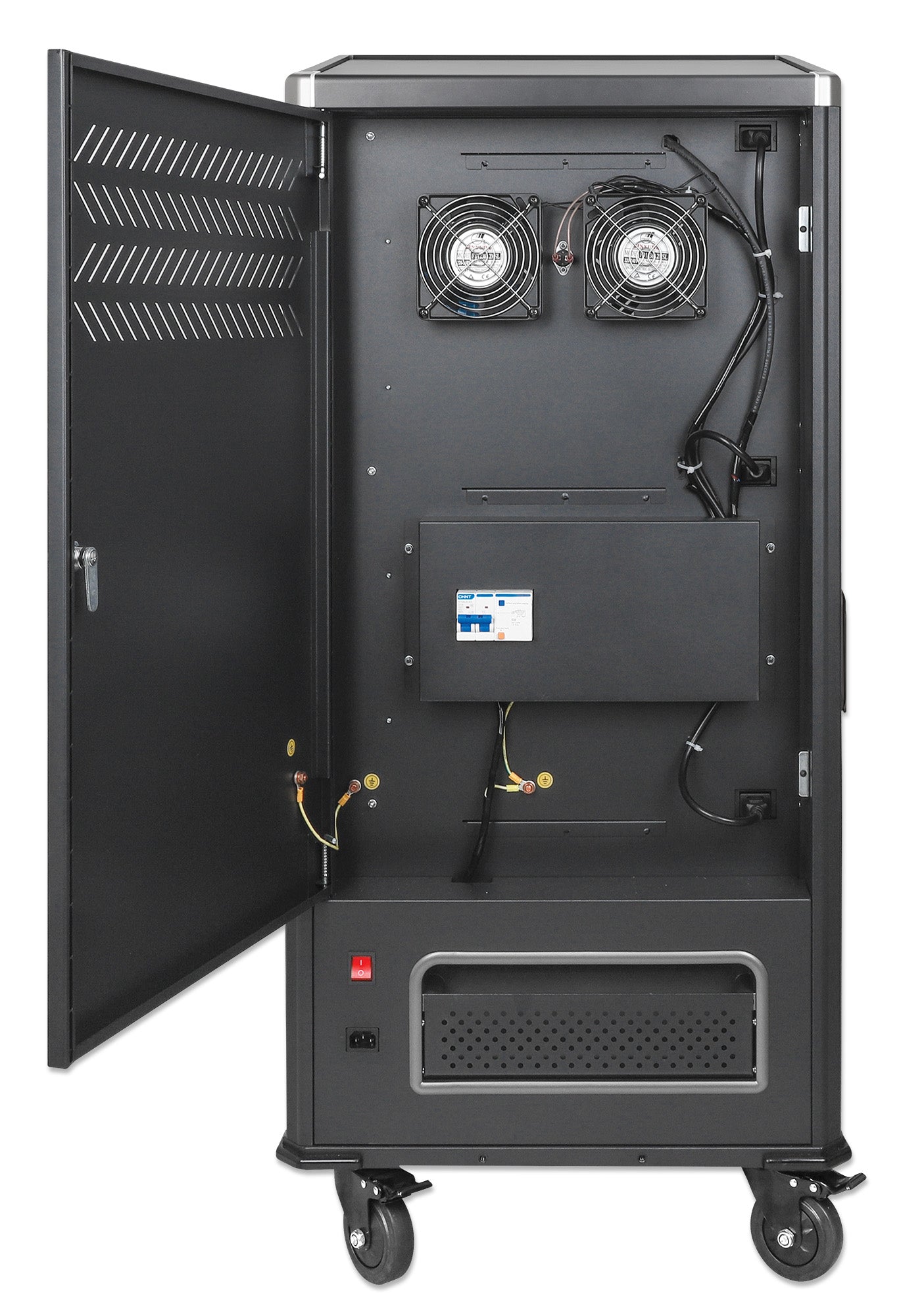 - Porte latérale avec serrure à clé pour accéder au système de gestion de l'alimentation, aux ventilateurs et à l'interrupteur de fusible