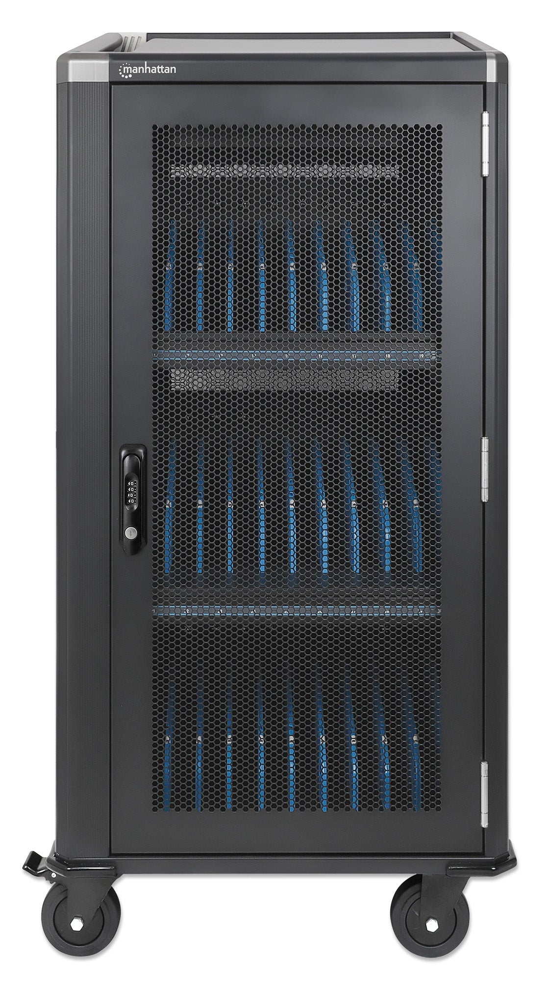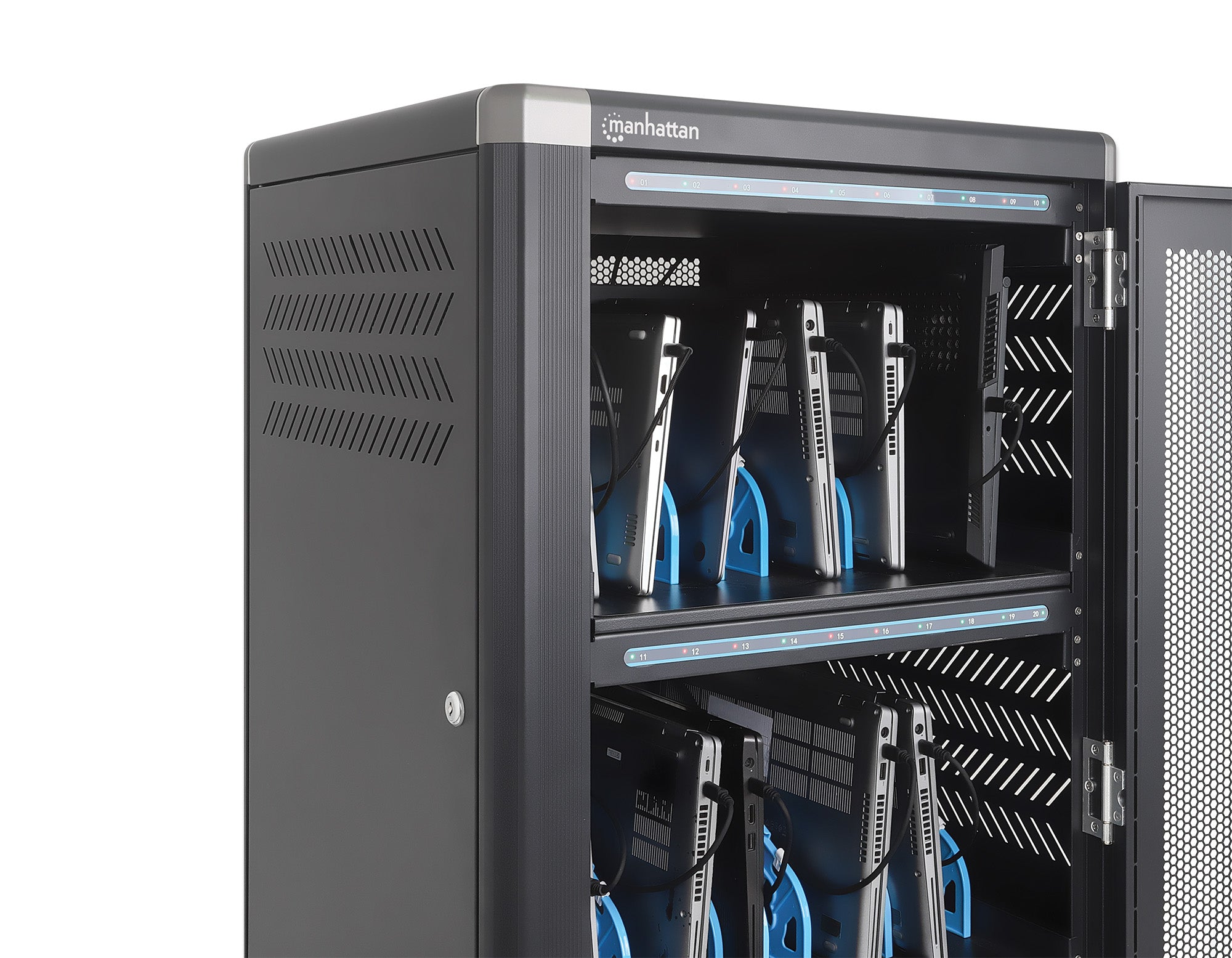 - 30 emplacements spacieux pour appareils, 400 (L) x 34 (l) x 275 (H) mm chacun, avec gestion des câbles intégrée dans les séparateurs