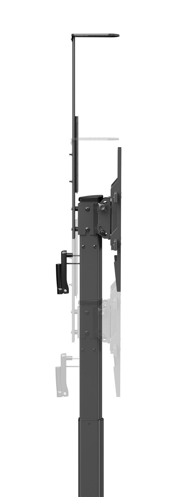 Supporte un téléviseur de 37" à 86" jusqu'à 70 kg, inclinaison de -12 à 5°, rotation à 90°, étagères pour caméra et appareils audiovisuels, tableau perforé, hauteur réglable avec manivelle, noir