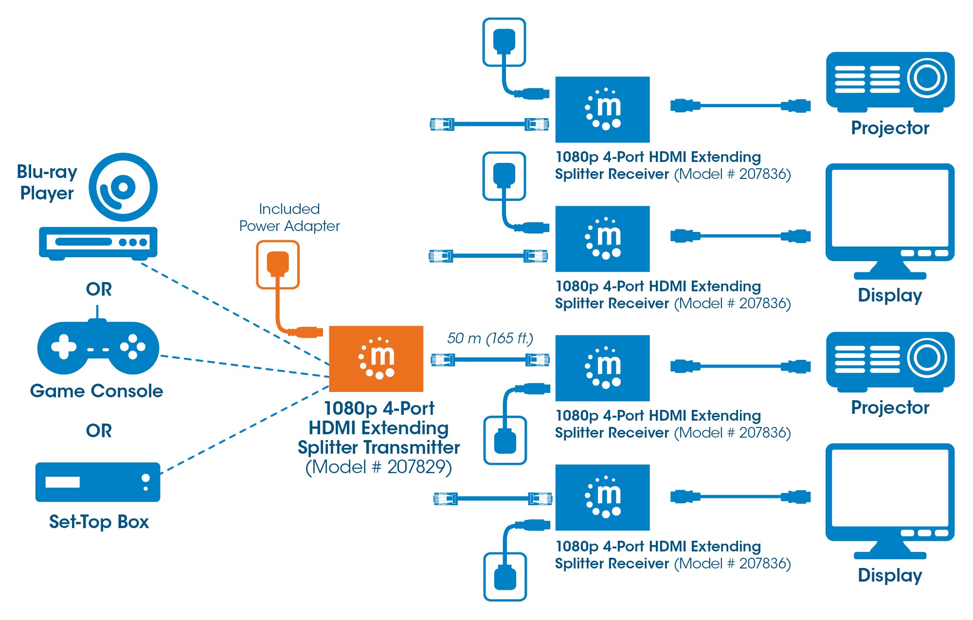 - Reproduit et étend un signal audio/vidéo digital Haute Définition (HD) à un maximum de quatre Récepteurs (207836) Répartiteur HDMI 1080p Extensible HD à une distance maximum de 50 mètres grâce à l'utilisation d'un câble Ethernet
