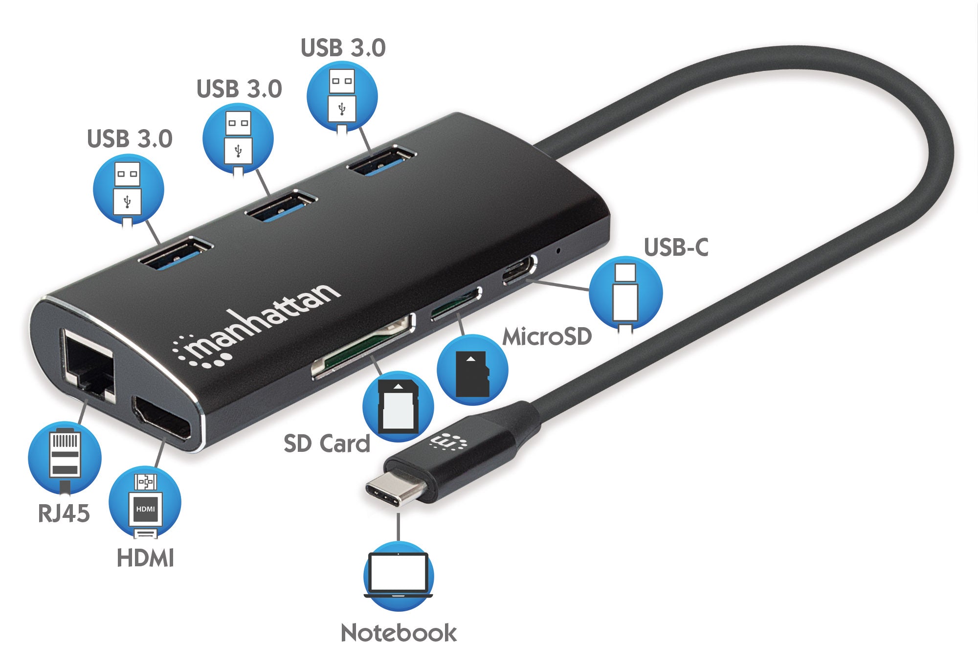USB 3.2 Gen 1 Type-C mâle ver HDMI (4Kà30Hz) femelle, trois ports USB-A SuperSpeed montés sur le dessus, port USB C Power Delivery (PD 3.0), port RJ45 Gigabit et lecteur de carte SD/MicroSD ; aluminium, noir