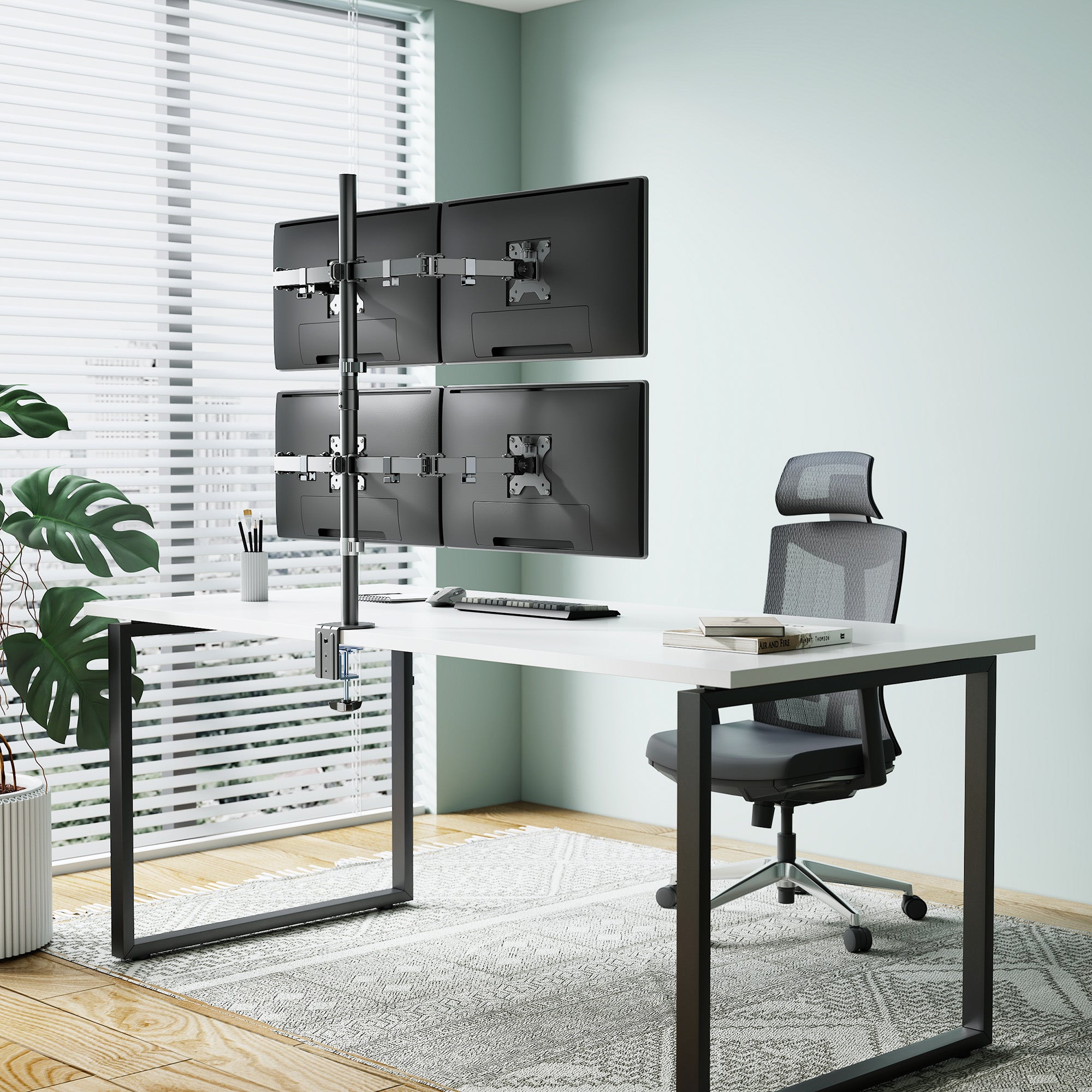 - Positionne les écrans LCD au-dessus du bureau pour libérer de l'espace et réduire l'encombrement